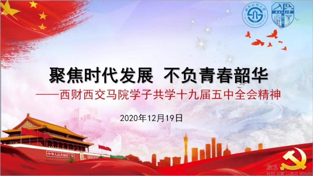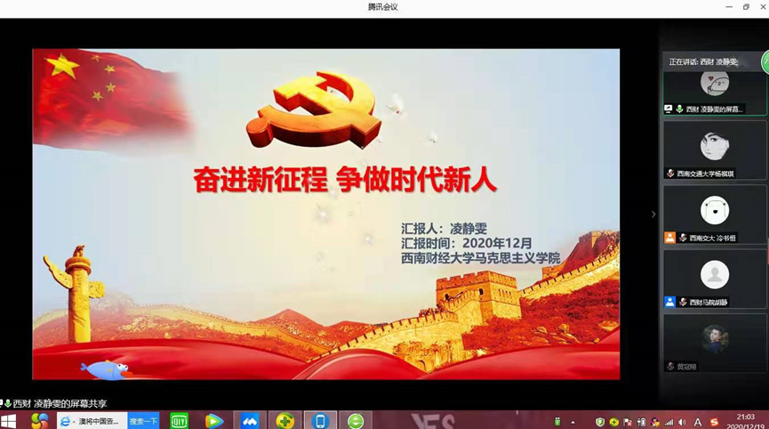 2020年12月19日晚,为深入学习领会、扎实贯彻落实党的十九届五中全会精神,进一步坚定理想信念,强化理论武装,激发奋斗精神,练就过硬本领,把思想和行动统一到全会精神上来,西南交通大学tyc1286太阳成集团2019级硕士班联合tyc1286太阳成集团2019级硕士班,开展了以“聚焦时代发展 不负青春韶华”为主题的线上班会活动。活动由西南交大马院2019级硕士班班长冷书恒主持。